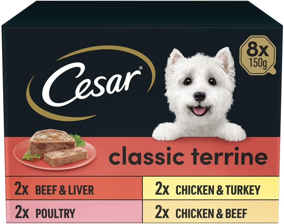 - CESAR dog food trays includes eight classic terrine complete dog food options including: tender Turkey and Chicken dog food, succulent Liver and Beef dog food, tender Poultry, savoury Chicken and Beef