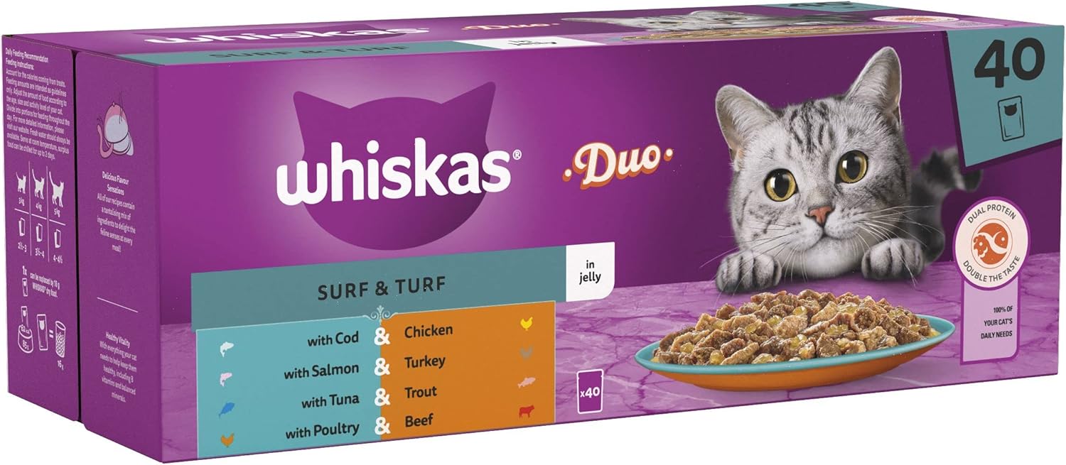 Whiskas Tasty Duo 1+ Surf & Turf in Jelly 40x85g Pouches, Adult Cat Food